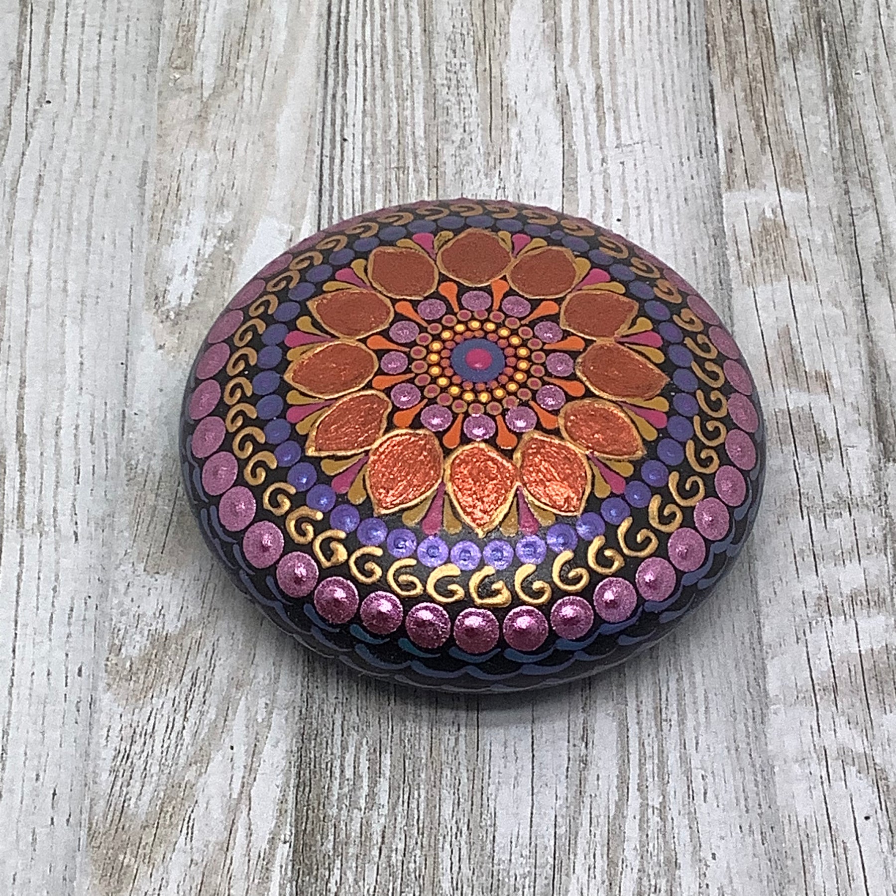 This handcrafted mandala stone has been carefully painted with dots in copper, pink, and purple tones, forming a radiant circular design that feels both calming and energizing. The glossy varnish not only protects the paint but also enhances the vibrant colors and gives the surface a smooth shine.