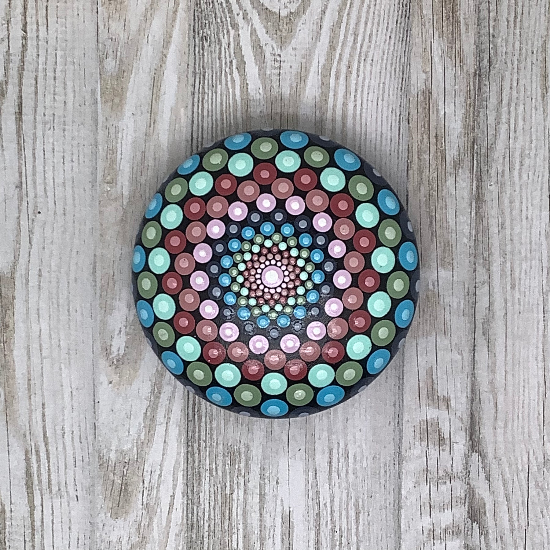 This is a 7,5 cm painted rock- hand painted by me, with dots in different colors, forming a beautiful calming and energizing mandala.